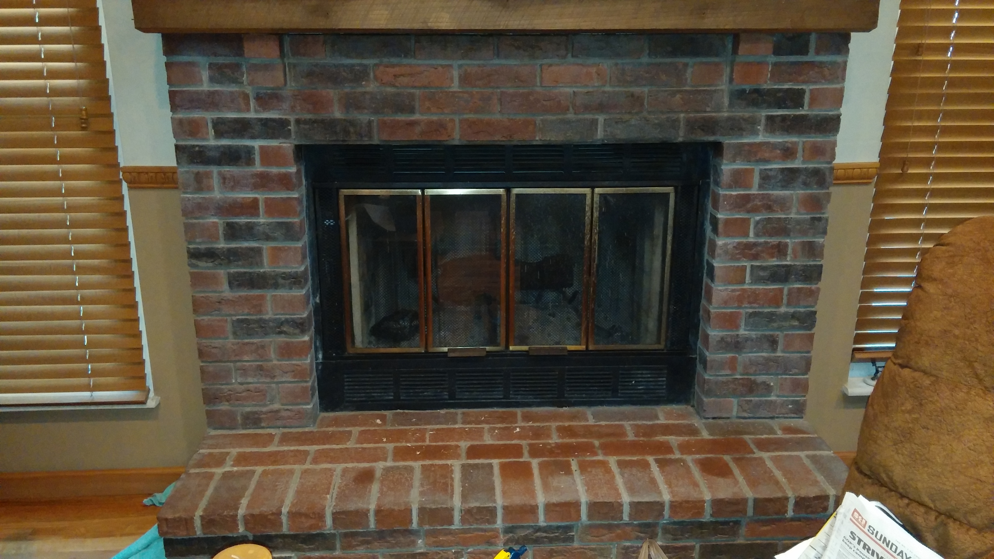 We have a brick fireplace and like most houses from the 80’s the bricks are dark red and black – not that there’s anything wrong with that! I never really paid much attention to it, I just figured that was how it was and it didn’t occur to me that we could/should change it. Well, that wasn’t a satisfactory answer for Jen and she set out to figure out how to change it. Boy, am I glad she did!